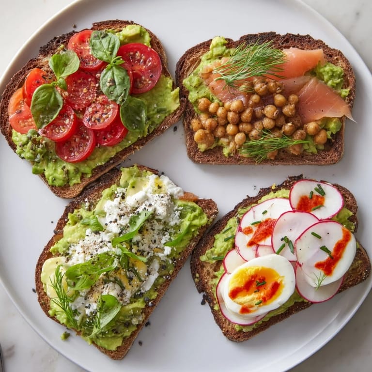 - Prepare each toast with its unique topping: For Classic Tomato & Basil Top with halved cherry tomatoes, crumbled feta, and fresh basil; For Smoked Salmon & Dill Spread a thin layer of cream cheese, add smoked salmon, sprinkle with capers and dill; For Spicy Chickpea & Radish Toss chickpeas with olive oil and paprika, spoon over toast, and top with radish slices; For Egg & Sriracha Layer with egg slices, drizzle with sriracha, and sprinkle with chives.