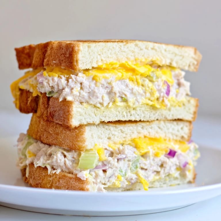 Save A golden, crispy sandwich filled with creamy tuna salad and gooey melted cheese — the perfect quick and satisfying snack.