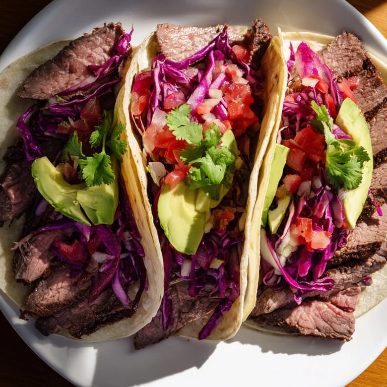- Fresh toppings: Red cabbage adds crunch, pico de gallo brings acid and freshness, avocado melts into warmth from the steak, and cilantro is the final bright note that pulls it all together.