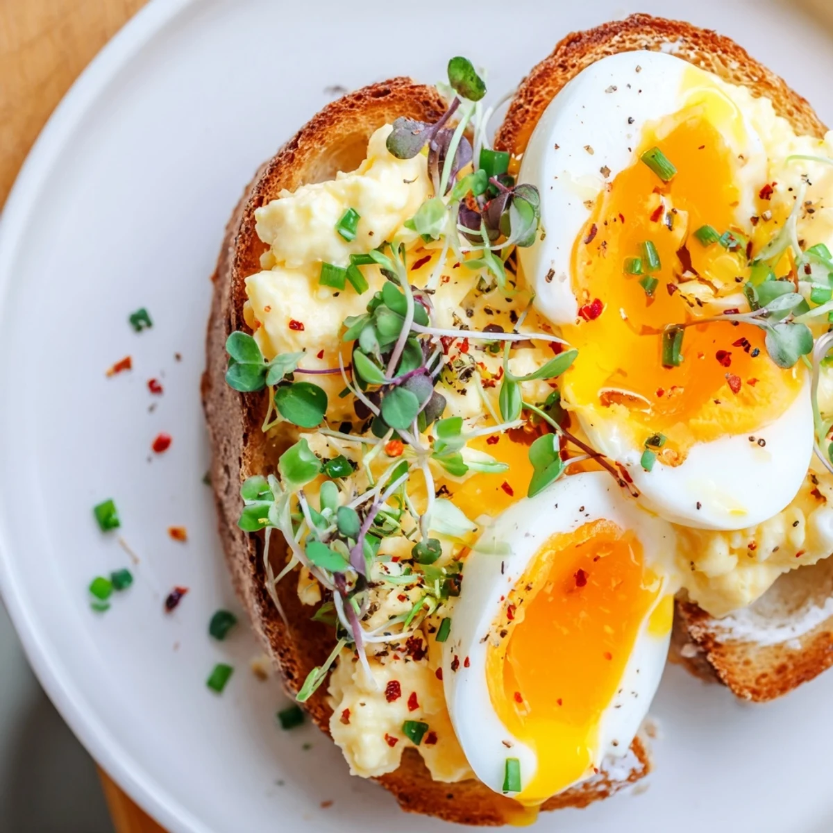 - Place the toasted bread on a plate and divide it into thirds in your mind: scrambled eggs on the left, halved soft-boiled on the center, fried egg on the right. This arrangement lets you taste each preparation as its own moment, or all together in one bite.