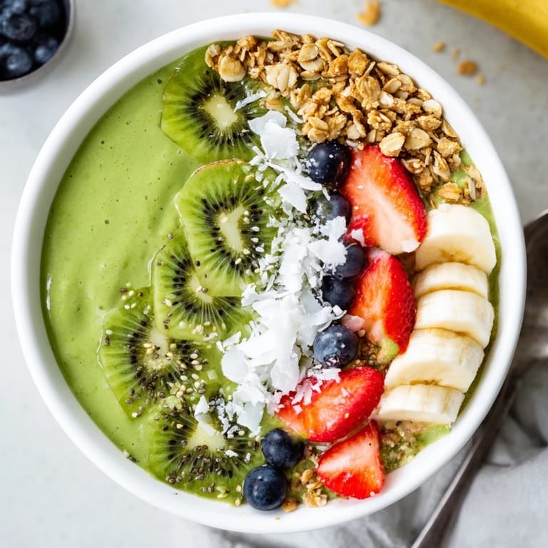 The smoothie base is best enjoyed immediately after blending to maintain its creamy texture and vibrant green color. If you need to prep ahead, you can portion and freeze the ingredients, then blend when ready. The toppings can be prepared in advance and stored separately in airtight containers.