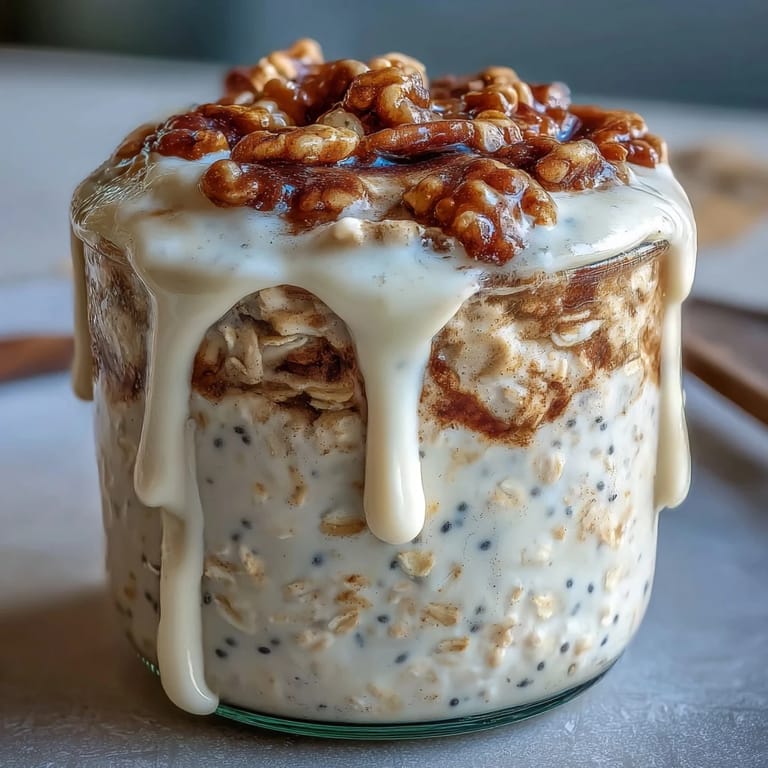 These overnight oats blur the line between treat and fuel in a way that actually matters when you're trying to make better choices without feeling deprived. The cinnamon and cream cheese drizzle hit the same pleasure centers as a bakery pastry, but the protein and fiber are quietly doing the work of keeping you energized and satisfied. I've learned that breakfast doesn't have to choose between tasting amazing and being good for you.