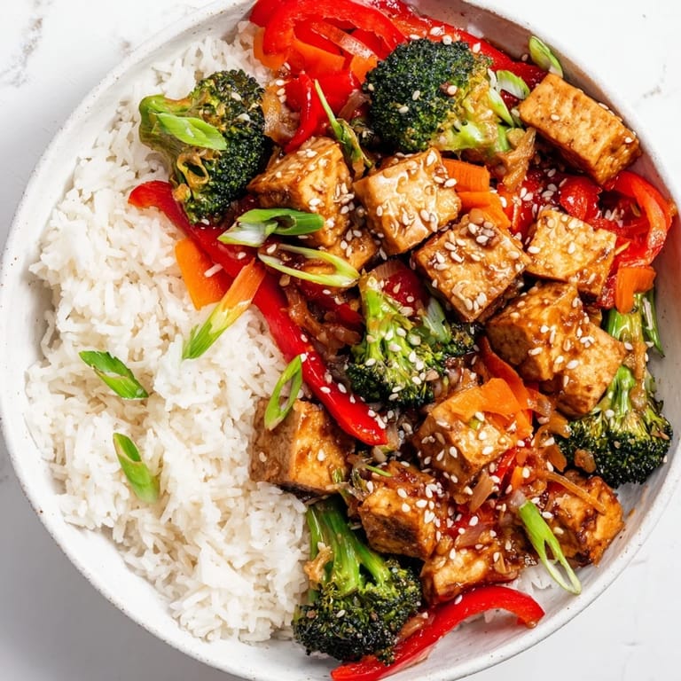 Fluffy jasmine or brown rice both complement the savory-sweet sauce and provide a wholesome base for the tofu and vegetables.