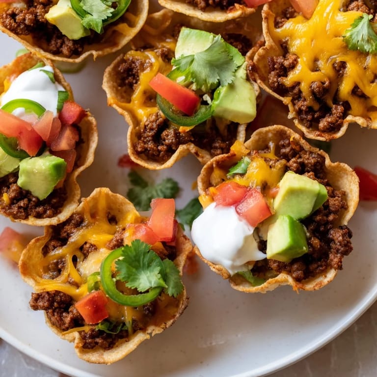 Save There's something magical about watching a kitchen full of people gather around a platter of these mini taco cups—everyone reaches for one without thinking twice. I stumbled onto this recipe one Friday when I needed something that felt special but didn't demand hours at the stove, and it's become my go-to when I want food that actually brings people together. The beauty is in the simplicity: crispy tortilla shells baked right in a muffin tin, filled with seasoned beef and melted cheese, then topped however your guests prefer. It's like tacos had a clever edit, losing nothing in the process.