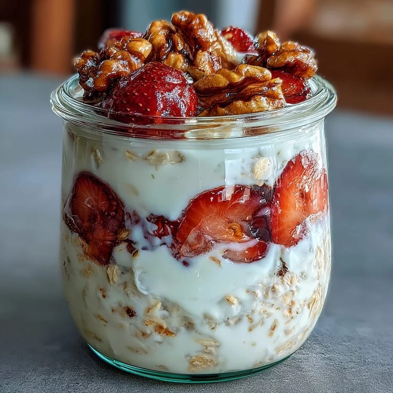 - Give your oat mixture a good stir since it'll have thickened overnight; if it looks too thick, splash in a bit more milk. Layer oats, fresh strawberry slices, and those candied walnuts into a bowl or keep it in the jar, then add a few more berries on top and an extra drizzle of maple syrup if you're feeling it.
