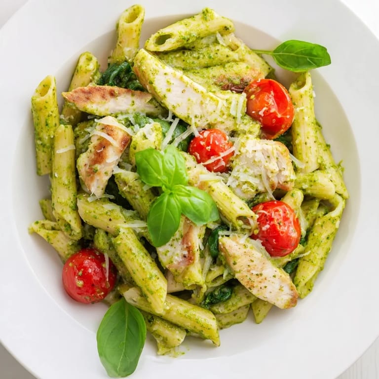 Save There was nothing fancy about the night I threw this together, just a Tuesday after work when the fridge felt bare but my stomach disagreed. I had a jar of pesto tucked behind the milk, some chicken I'd meant to use days ago, and pasta in the pantry. Twenty minutes later, I was twirling fork after fork of basil-scented pasta with juicy chicken and warm cherry tomatoes, wondering why I ever overthought dinner. It became my weeknight rescue ever since.