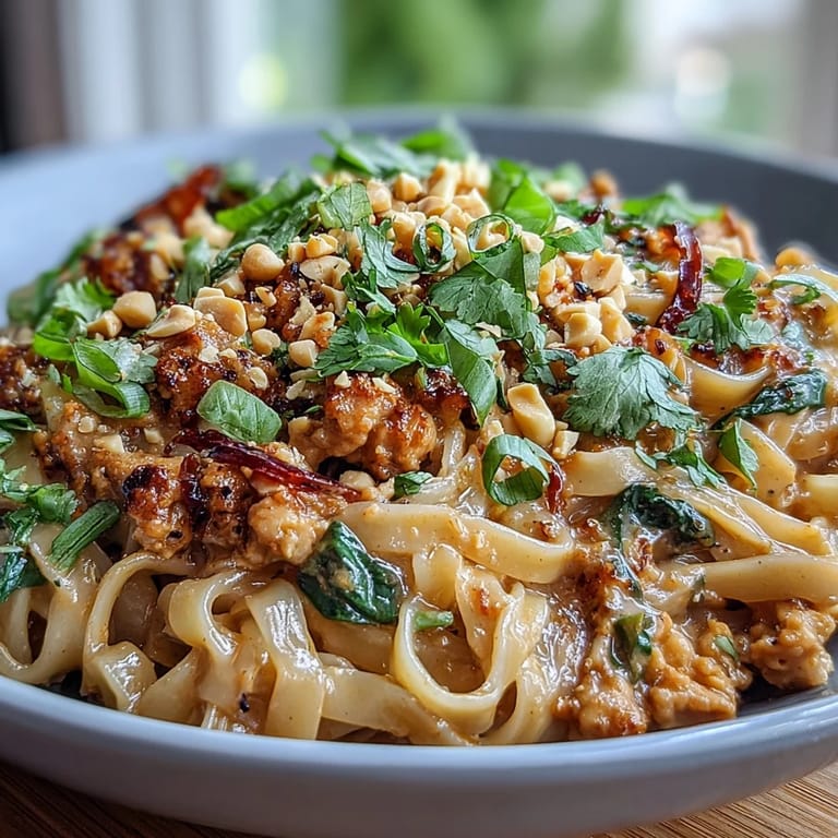 Save There's something magical about the sizzle that happens when you dump everything into one pan and let it meld together. I discovered this creamy Thai-inspired noodle technique on a Tuesday night when I was too tired to dirty multiple pots, and somehow that one-pan approach became the whole point. The way the noodles soak up that peanut sauce while the chicken crisps at the edges feels like controlled chaos in the best way. Now it's become my go-to when I need something that tastes like I spent hours cooking but actually takes less than forty minutes. Friends always assume there's more technique involved than there actually is.
