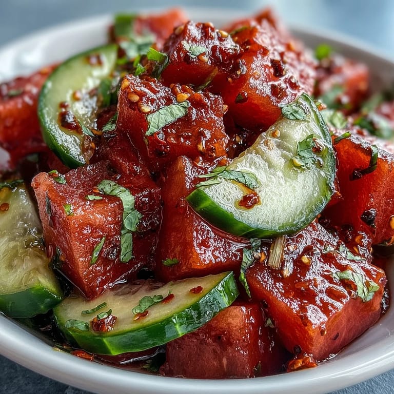 Save The first time I tossed together this watermelon cucumber salad, the kitchen was filled with the soft plink of juicy cubes hitting the bowl and the sharp, citrusy perfume of lime hanging in the air. I was looking for something light and cooling after a sun-soaked afternoon, and my craving led to this unexpectedly addictive combination. The crunchy cucumber and sweet watermelon, finished with a kick of Tajin, quickly disappeared as friends wandered in with pool-dripping hair and hungry grins. There was laughter over who got the extra fennel frond I tossed in by accident once, and from then on, this dish became our unofficial marker of when summer had truly arrived.